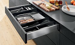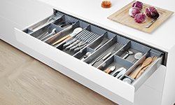 อุปกรณ์เสริมในลิ้นชัก (Kitchen accessories) ยี่ห้อ Blum ช่วยให้การจัดแบ่งภายในลิ้นชักมีการจัดวางสิ่งของเครื่องใช้ต่างๆ สามารถหยิบใช้สอยได้สะดวก เป็นระเบียบเรียบร้อยและสวยงาม ไม่ว่าจะเป็น หม้อ กระทะ หรือแม้กระทั่งอุปกรณ์ในห้องน้ำ ทุกอย่างอยู่ในที่ที่สามารถหยิบใช้สอยได้อย่างง่ายดาย มองเห็นได้อย่างชัดเจน พื้นที่จัดเก็บสิ่งของต่างๆ ถูกใช้งานได้อย่างมีประสิทธิภาพ และสามารถปรับให้เหมาะสมกับความต้องการได้