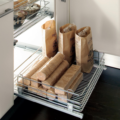 Basket H 120 on concealed full extension slides with dampened return and right/left ABS side covers. Three-way adjustable door brackets